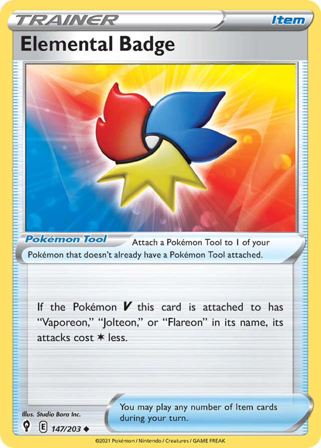 If the Pokémon V this card is attached to has "Vaporeon," "Jolteon," or "Flareon" in its name, its attacks cost Colorless less. You may play any number of Item cards during your turn. Attach a Pokémon Tool to 1 of your Pokémon that doesn't already have a Pokémon Tool attached.