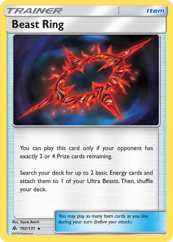 You can play this card only if your opponent has exactly 3 or 4 Prize cards remaining. Search your deck for up to 2 basic Energy cards and attach them to 1 of your Ultra Beasts. Then, shuffle your deck. You may play as many Item cards as you like during your turn (before your attack).