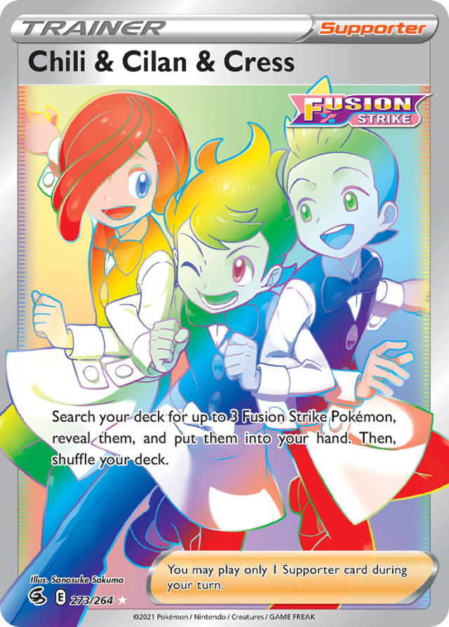 Search your deck for up to 3 Fusion Strike Pokémon, reveal them, and put them into your hand. Then, shuffle your deck. You may play only 1 Supporter card during your turn.