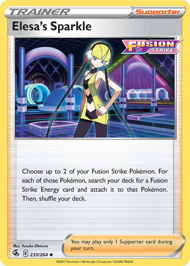 Choose up to 2 of your Fusion Strike Pokémon. For each of those Pokémon, search your deck for a Fusion Strike Energy card and attach it to that Pokémon. Then, shuffle your deck. You may play only 1 Supporter card during your turn.