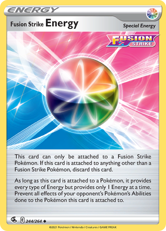 This card can only be attached to a Fusion Strike Pokémon. If this card is attached to anything other than a Fusion Strike Pokémon, discard this card. As long as this card is attached to a Pokémon, it provides every type of Energy but provides only 1 Energy at a time. Prevent all effects of your opponent's Pokémon's Abilities done to the Pokémon this card is attached to.