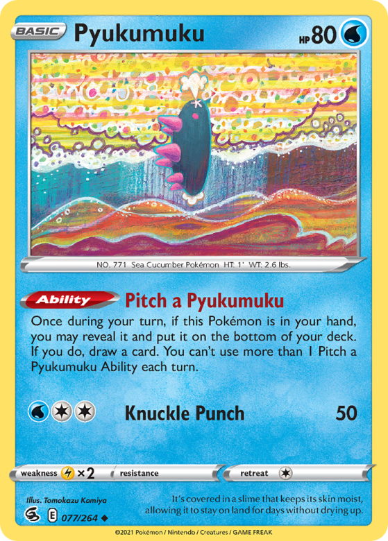 Once during your turn, if this Pokémon is in your hand, you may reveal it and put it on the bottom of your deck. If you do, draw a card. You can't use more than 1 Pitch a Pyukumuku Ability each turn.