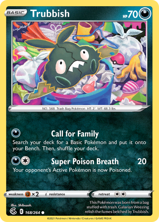 This Pokémon was born from a bag stuffed with trash. Galarian Weezing relish the fumes belched by Trubbish.