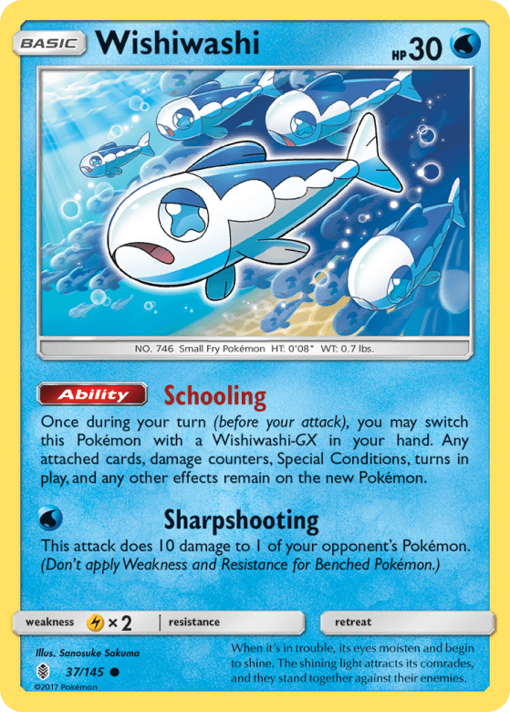 Once during your turn (before your attack), you may switch this Pokémon with a Wishiwashi-GX in your hand. Any attached cards, damage counters, Special Conditions, turns in play, and any other effects remain on the new Pokémon.