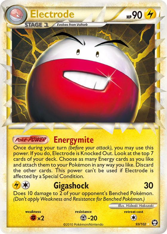 Once during your turn (before your attack), you may use this power. If you do, Electrode is Knocked Out. Look at the top 7 cards of your deck. Choose as many Energy cards as you like and attach them to your Pokémon in any way you like. Discard the other cards. This power can't be used if Electrode is affected by a Special Condition.