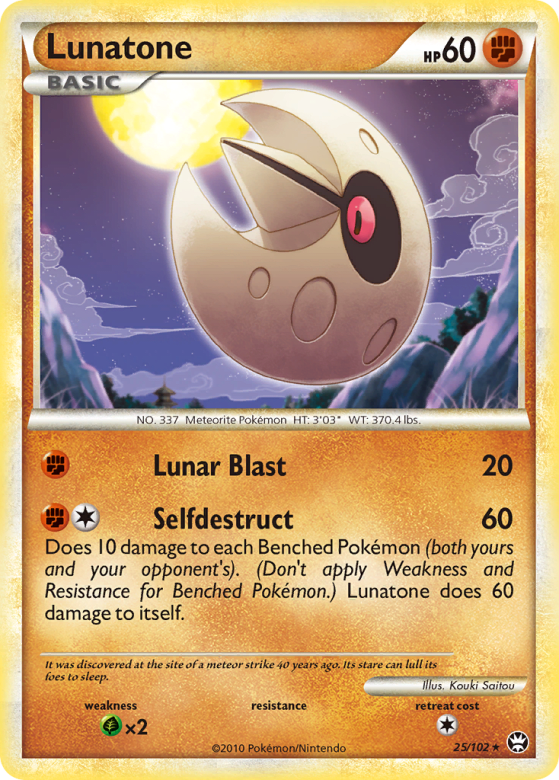 Does 10 damage to each Benched Pokémon (both yours and your opponent's). (Don't apply Weakness and Resistance for Benched Pokémon.) Lunatone does 60 damage to itself.