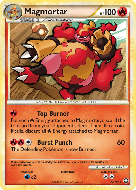 For each Fire Energy attached to Magmortar, discard the top card from your opponent's deck. Then, flip a coin. If tail, discard all Fire Energy attached to Magmortar.