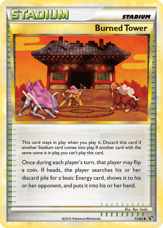 This card stays in play when you play it. Discard this card if another Stadium card comes into play. If another card with the same name is in play, you can't play this card. Once during each player's turn, that player may flip a coin. If heads, the player searches his or her discard pile for a basic Energy card, shows it to his or her opponent, and put it into his or her hand.