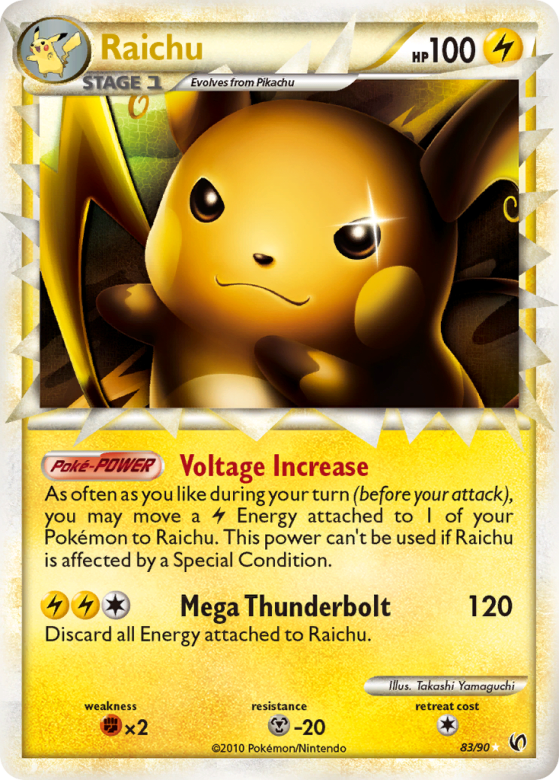 As often as you like during your turn (before your attack), you may move a Lightning Energy attached to 1 of your Pokémon to Raichu. This power can't be used if Raichu is affected by a Special Condition.
