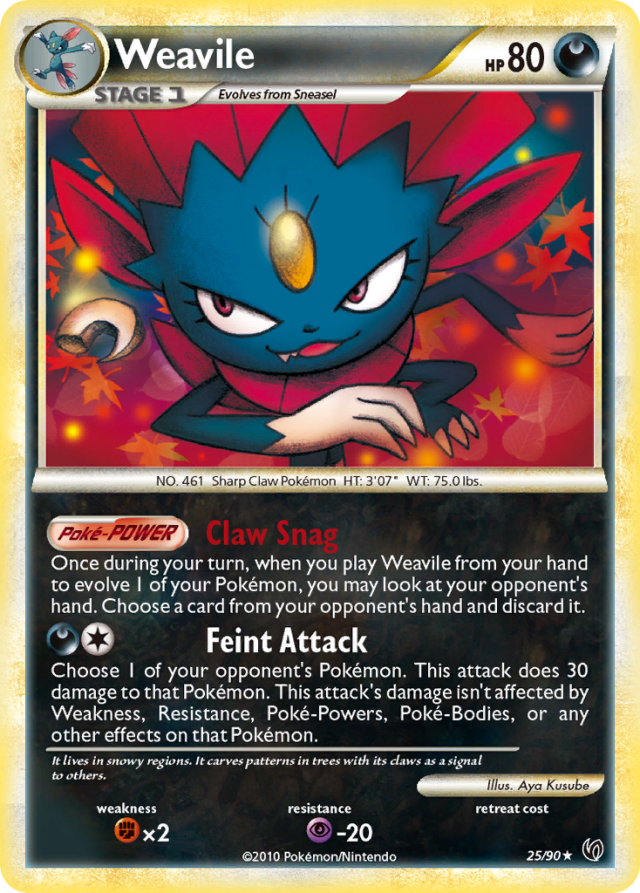 Once during your turn, when you play Weavile from your hand to evolve 1 of your Pokémon, you may look at your opponent's hand. Choose a card from your opponent's hand and discard it.