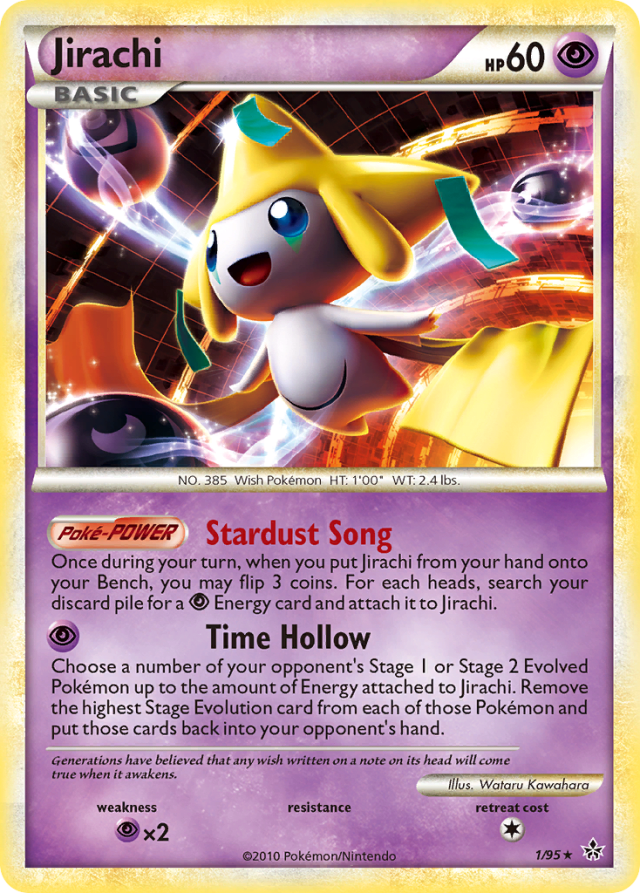 Once during your turn, when you put Jirachi from your hand onto your Bench, you may flip 3 coins. For each heads, search your discard pile for a Psychic Energy card and attach it to Jirachi.