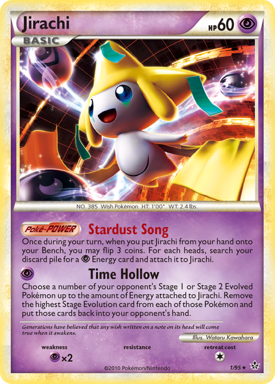 Choose a number of your opponent's Stage 1 or Stage 2 Evolved Pokémon up to the amount of Energy attached to Jirachi. Remove the highest Stage Evolution card from each of those Pokémon and put those cards back into your opponent's hand.