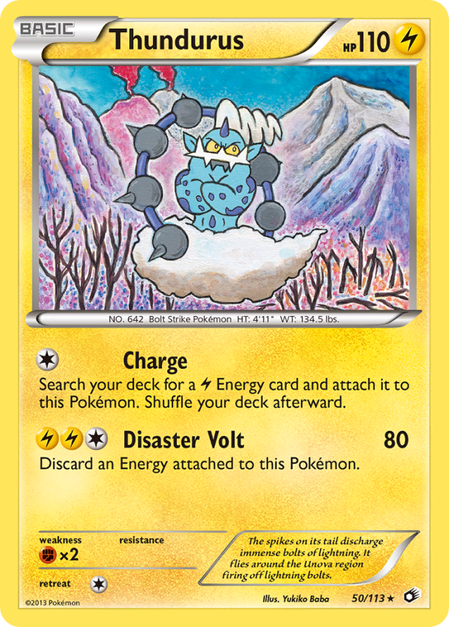 The spikes on its tail discharge immense bolts of lightning. It flies around the Unova region firing off lightning bolts.