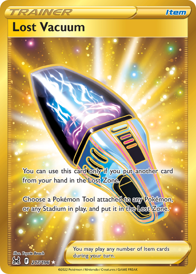 You can use this card only if you put another card from your hand in the Lost Zone. Choose a Pokémon Tool attached to any Pokémon, or any Stadium in play, and put it in the Lost Zone. You may play any number of Item cards during your turn.