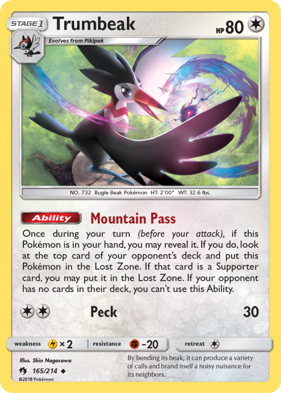 Once during your turn (before your attack), if this Pokémon is in your hand, you may reveal it. If you do, look at the top card of your opponent's deck and put this Pokémon in the Lost Zone. If that card is a Supporter card, you may put it in the Lost Zone. If your opponent has no cards in their deck, you can't use this Ability.