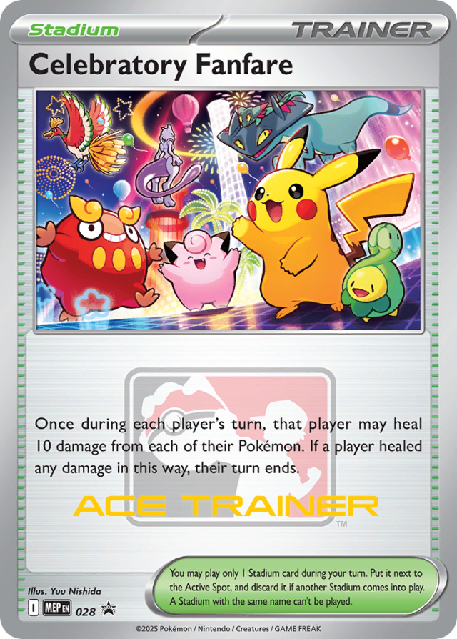 Once during each player's turn, that player may heal 10 damage from each of their Pokémon. If a player healed any damage in this way, their turn ends. You may play only 1 Stadium card during your turn. Put it next to the Active Spot, and discard it if another Stadium comes into play. A Stadium with the same name can't be played.