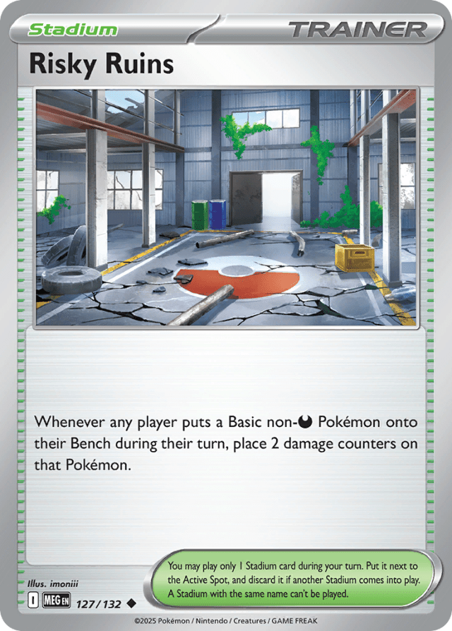 Whenever any player puts a Basic non-Darkness Pokémon onto their Bench during their turn, place 2 damage counters on that Pokémon. You may play only 1 Stadium card during your turn. Put it next to the Active Spot, and discard it if another Stadium comes into play. A Stadium with the same name can't be played.