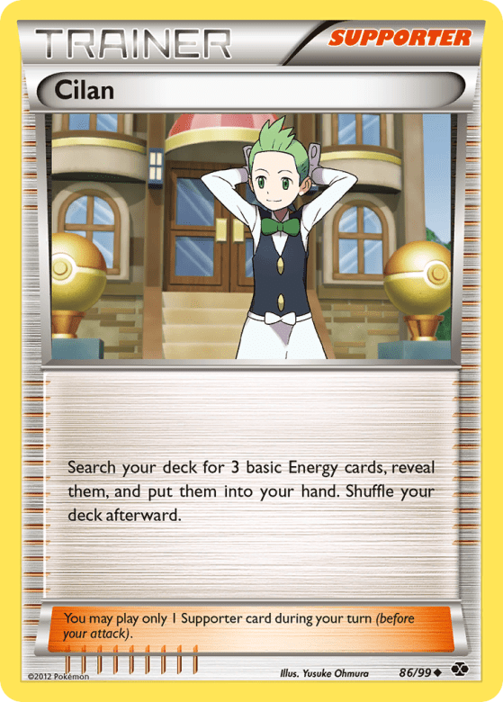 Search your deck for up to 3 basic Energy cards, reveal them, and put them into your hand. Shuffle your deck afterward. You may play only 1 Supporter card during your turn (before your attack).