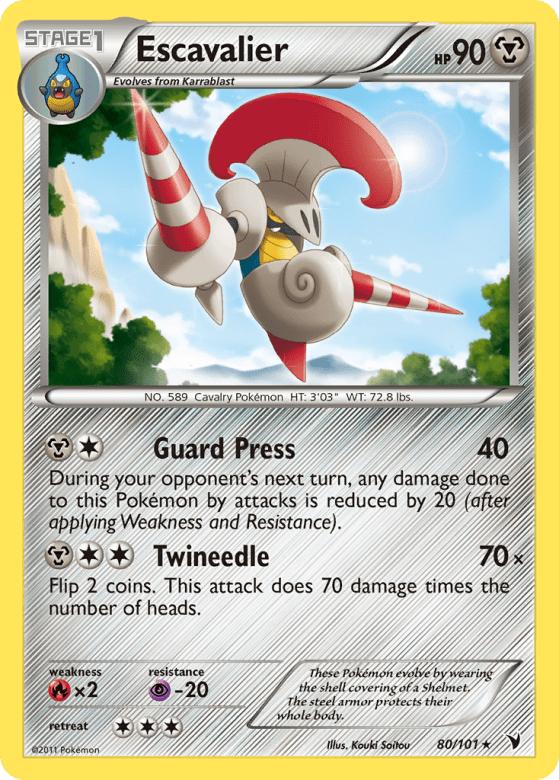 These Pokémon evolve by wearing the shell covering of a Shelmet. The steel armor protects their whole body.