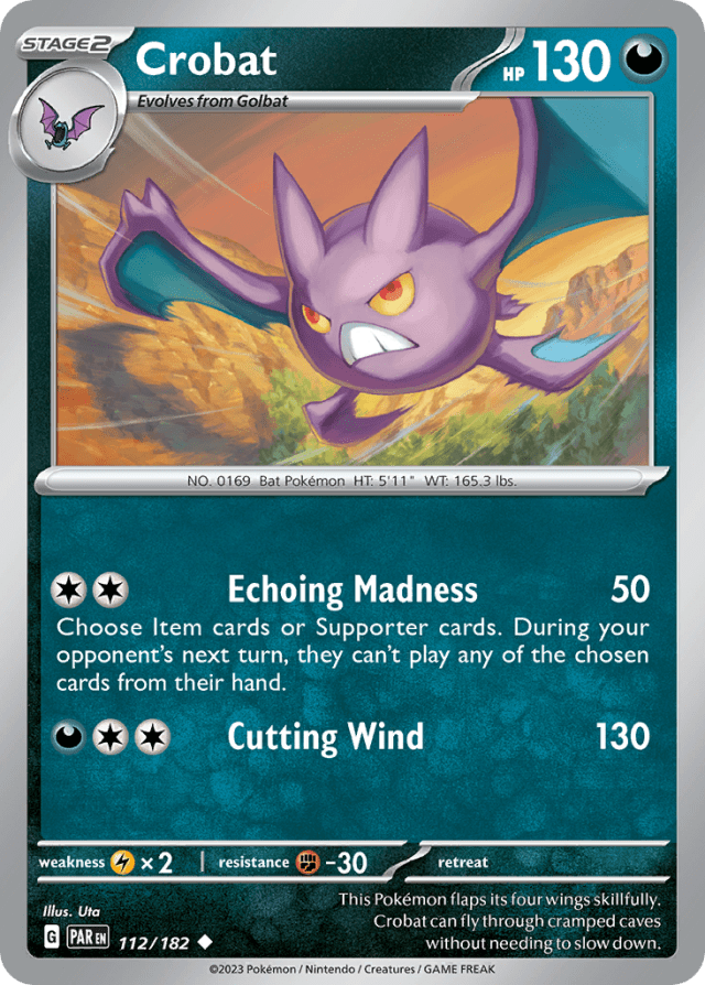 This Pokémon flaps its four wings skillfully. Crobat can fly through cramped caves without needing to slow down.