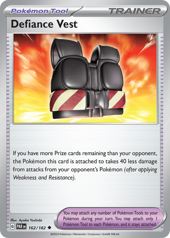 If you have more Prize cards remaining than your opponent, the Pokémon this card is attached to takes 40 less damage from attacks from your opponent's Pokémon (after applying Weakness and Resistance). You may attach any number of Pokémon Tools to your Pokémon during your turn. You may attach only 1 Pokémon Tool to each Pokémon, and it stays attached.