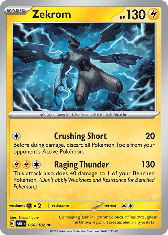 Concealing itself in lightning clouds, it flies throughout the Unova region. It creates electricity in its tail.