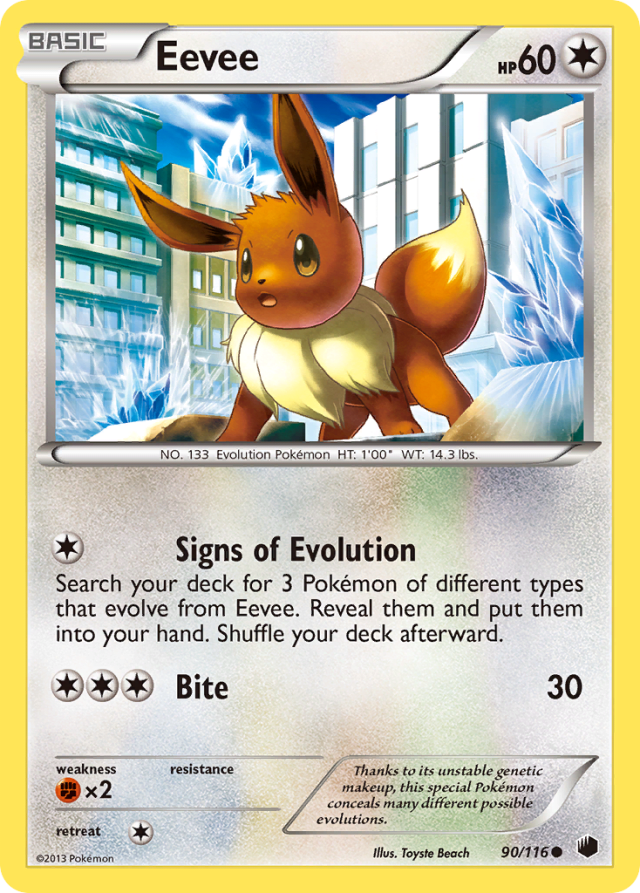 Search your deck for 3 Pokémon of different types that evolve from Eevee. Reveal them and put them into your hand. Shuffle your deck afterward.