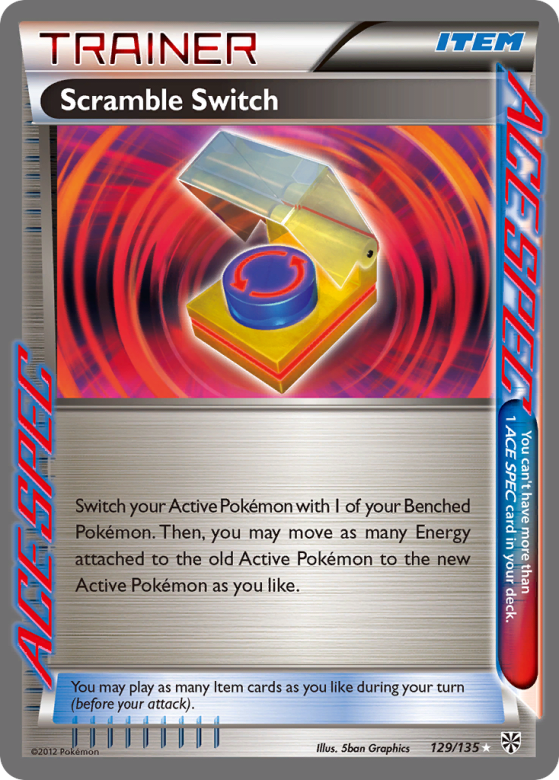 Switch your Active Pokémon with 1 of your Benched Pokémon. Then, you may move as many Energy attached to the old Active Pokémon to the new Active Pokémon as you like. You may play as many Item cards as you like during your turn (before your attack). You can't have more than 1 ACE SPEC card in your deck.