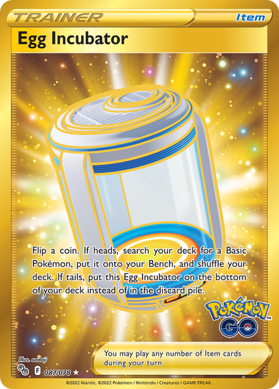Flip a coin. If heads, search your deck for a Basic Pokémon, put it onto your Bench, and shuffle your deck. If tails, put this Egg Incubator on the bottom of your deck instead of in the discard pile. You may play any number of Item cards during your turn.