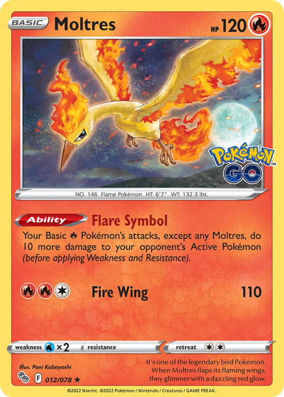 It's one of the legendary bird Pokémon. When Moltres flaps its flaming wings, they glimmer with a dazzling red glow.