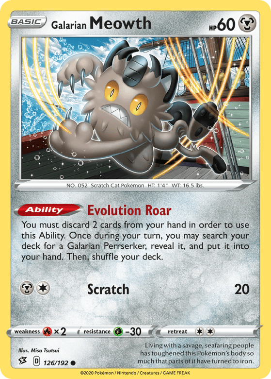 You must discard 2 cards from your hand in order to use this Ability. Once during your turn, you may search your deck for a Galarian Perrserker, reveal it, and put it into your hand. Then, shuffle your deck.