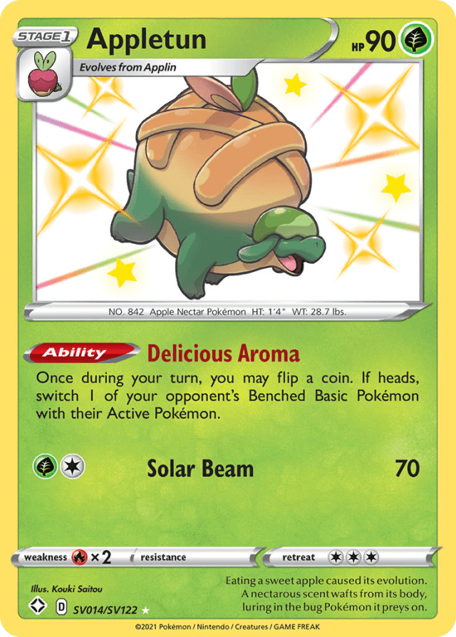Eating a sweet apple caused its evolution. A nectarous scent wafts from its body, luring in the bug Pokémon it preys on.