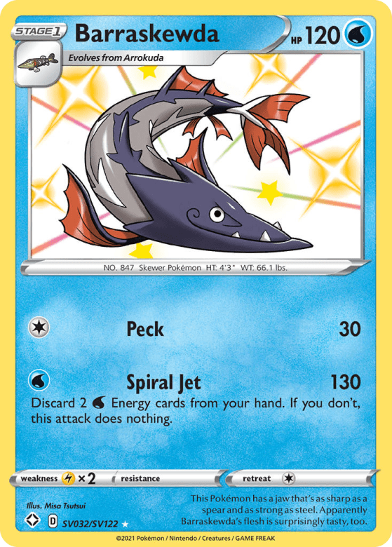 This Pokémon has a jaw that's as sharp as a spear and as strong as steel. Apparently Barraskewda's flesh is surprisingly tasty, too.