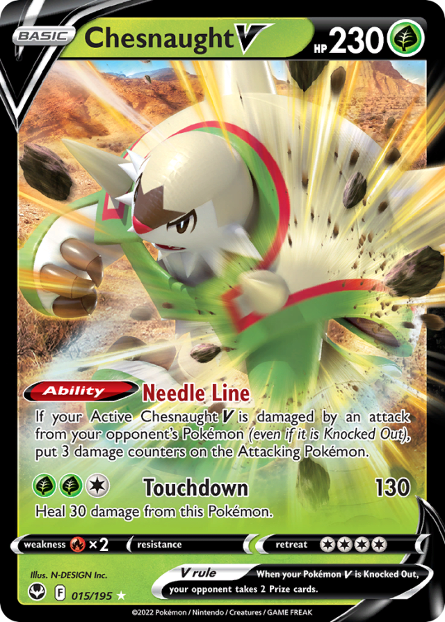 If your Active Chesnaught V is damaged by an attack from your opponent's Pokémon (even if it is Knocked Out), put 3 damage counters on the Attacking Pokémon.