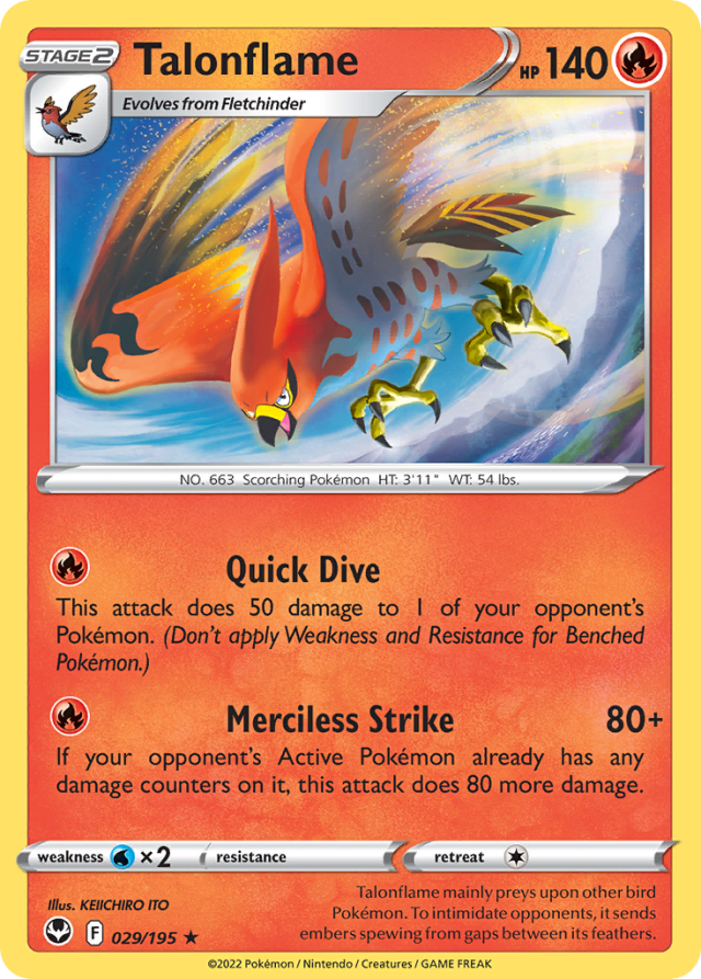 Talonflame mainly preys upon other bird Pokémon. To intimidate opponents, it sends embers spewing from gaps between its feathers.