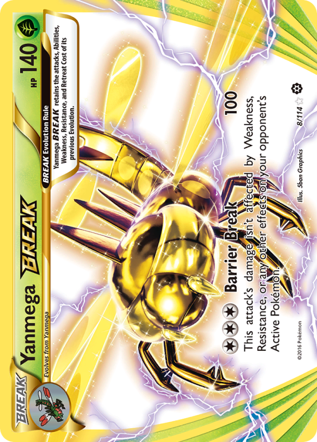 BREAK Evolution Rule: Yanmega BREAK retains the attacks, Abilities, Weakness, Resistance, and Retreat Cost of its previous Evolution.