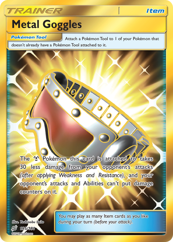 Attach a Pokémon Tool to 1 of your Pokémon that doesn't already have a Pokémon Tool attached to it. The Metal Pokémon this card is attached to takes 30 less damage from your opponent's attacks (after applying Weakness and Resistance), and your opponent's attacks and Abilities can't put damage counters on it. You may play as many Item cards as you like during your turn (before your attack).