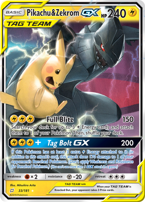 If this Pokémon has at least 3 extra Lightning Energy attached to it (in addition to this attack's cost), this attack does 170 damage to 1 of your opponent's Benched Pokémon. (Don't apply Weakness and Resistance for Benched Pokémon.) (You can't use more than 1 GX attack in a game.)