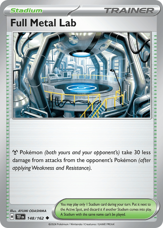 Metal Pokémon (both yours and your opponent's) take 30 less damage from attacks from the opponent's Pokémon (after applying Weakness and Resistance). You may play only 1 Stadium card during your turn. Put it into the Active Spot, and discard it if another Stadium comes into play. A Stadium with the same name can't be played.