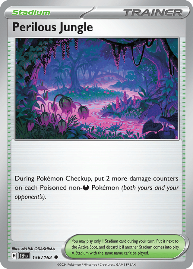 During Pokémon Checkup, put 2 more damage counters on each Poisoned non-Darkness Pokémon (both yours and your opponent's). You may play only 1 Stadium card during your turn. Put it next to the Active Spot, and discard it if another Stadium comes into play. A Stadium with the same name can't be played. You may play only 1 Stadium card during your turn. Put it into the Active Spot, and discard it if another Stadium comes into play. A Stadium with the same name can't be played.