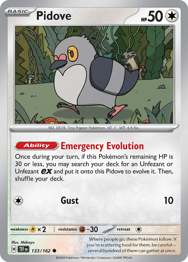 Once during your turn, if this Pokémon's remaining HP is 30 or less, you may search your deck for an Unfezant or Unfezant ex and put it onto this Pidove to evolve it. Then, shuffle your deck.