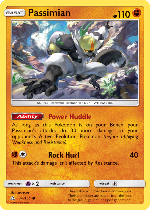 As long as this Pokémon is on your Bench, your Passimian's attacks do 30 more damage to your opponent's Active Evolution Pokémon (before applying Weakness and Resistance).