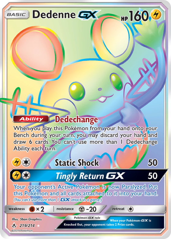 When you play this Pokémon from your hand onto your Bench during your turn, you may discard your hand and draw 6 cards. You can't use more than 1 Dedechange Ability each turn.