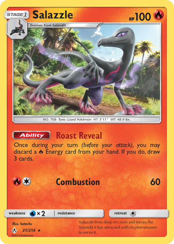 Salazzle lives deep in caves and forces the Salandit it has attracted with its pheromones to serve it.