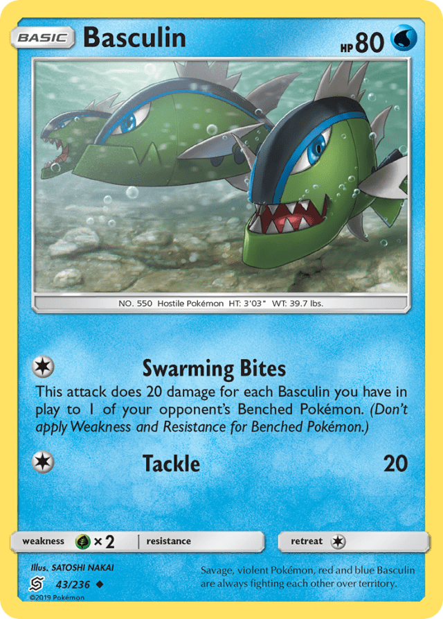 This attack does 20 damage for each Basculin you have in play to 1 of your opponent's Benched Pokémon. (Don't apply Weakness and Resistance for Benched Pokémon.)