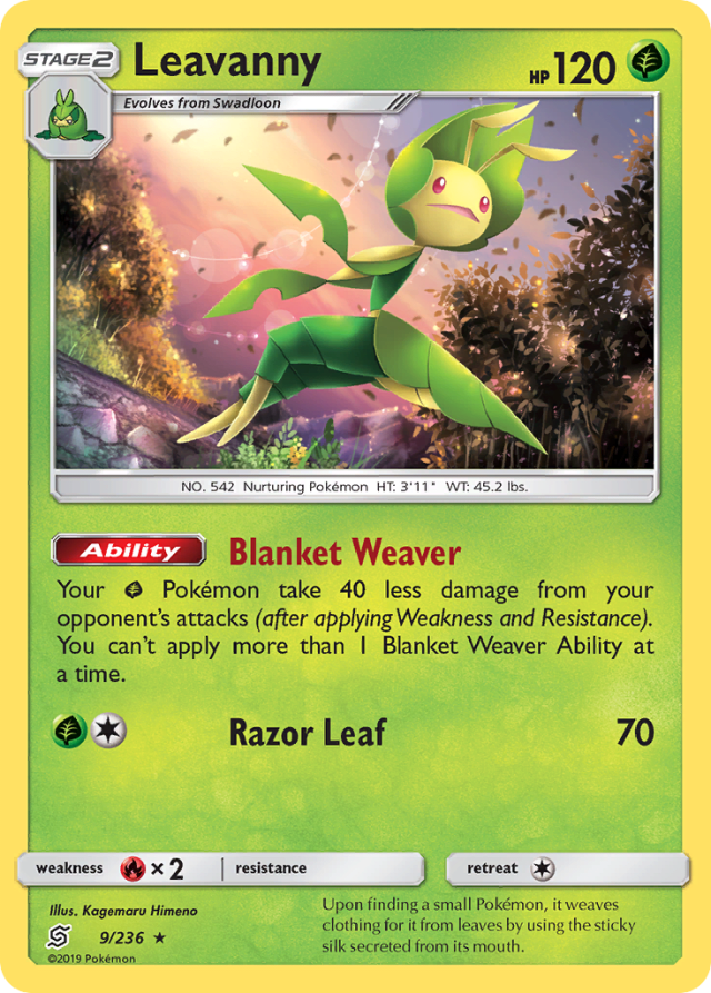 Your Grass Pokémon take 40 less damage from your opponent's attacks (after applying Weakness and Resistance). You can't apply more than 1 Blanket Weaver Ability at a time.