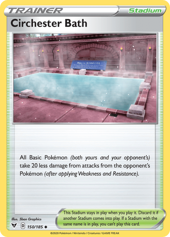 All Basic Pokémon (both yours and your opponent's) take 20 less damage from attacks from the opponent's Pokémon (after applying Weakness and Resistance). This Stadium stays in play when you play it. Discard it if another Stadium comes into play. If a Stadium with the same name is in play, you can't play this card.