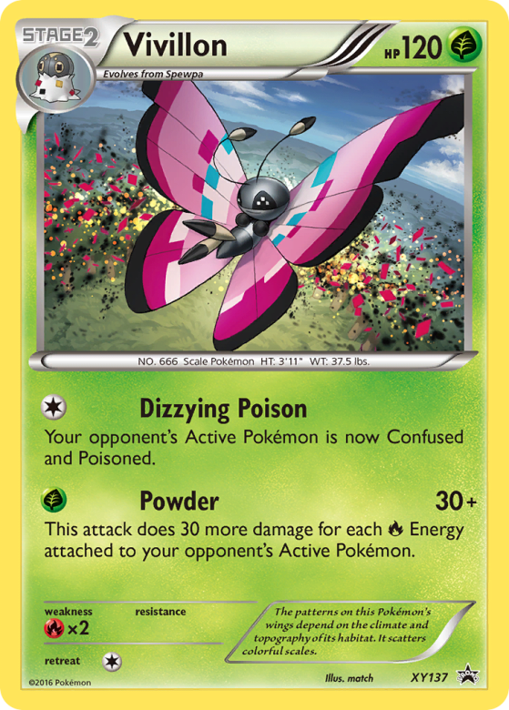 The patterns on this Pokémon's wings depend on the climate and topography of its habitat. It scatters colorful scales.