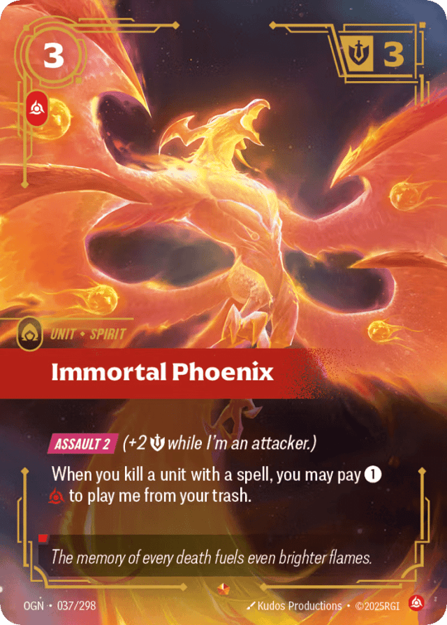 [Assault 2] (+2 {M} while I'm an attacker.) When you kill a unit with a spell, you may pay {1}{FR} to play me from your trash.