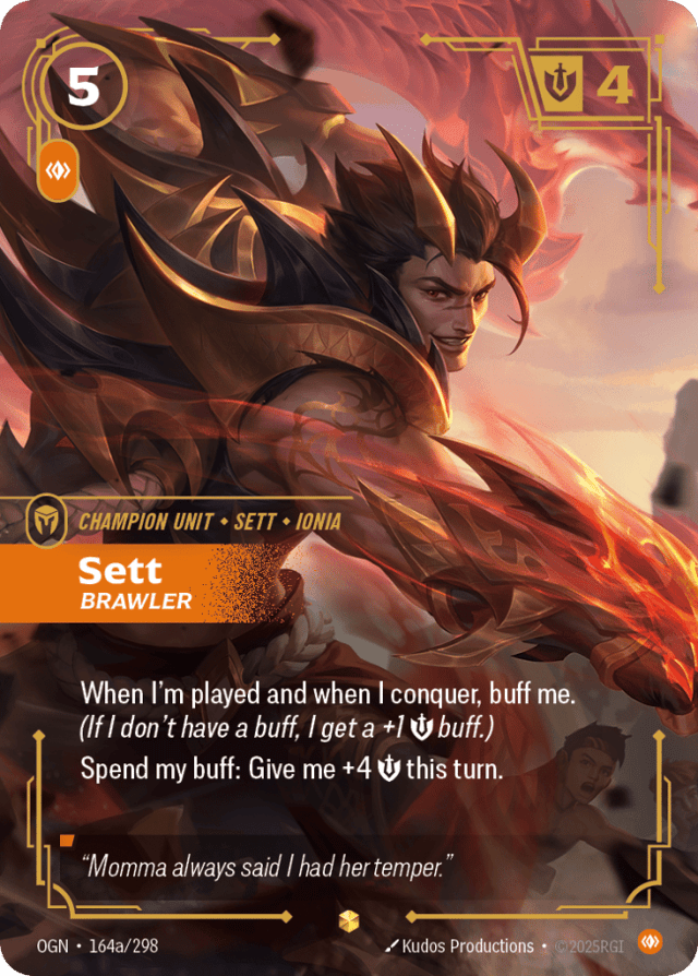 When I'm played and when I conquer, buff me. (If I don't have a buff, I get a +1 {M} buff.) Spend my buff: Give me +4 {M} this turn.
